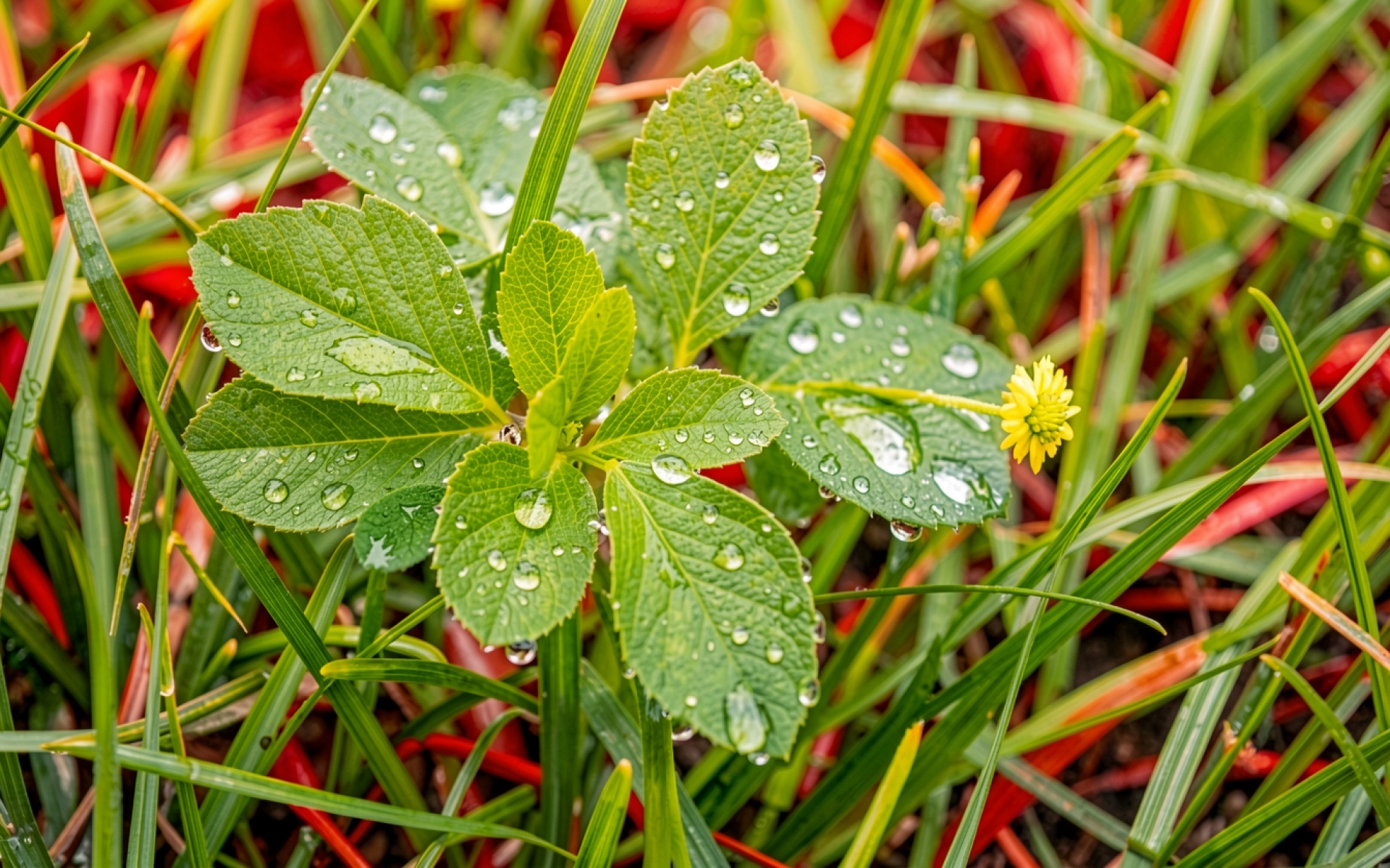 Изображение детально передает микрорельеф листовой пластины и сферическую форму водяных капель. Освещение создает четкие блики на поверхности воды и мягкие градиенты в тенях между травинками. Контраст насыщенного зеленого цвета листвы и красных оттенков фона подчеркивает глубину сцены. На сайте доступен удобный предпросмотр перед загрузкой для оценки качества на экране.