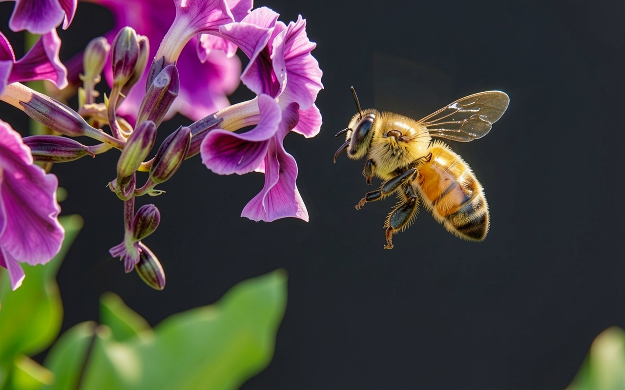 Изображение детально передает ворсистую текстуру тела насекомого и тонкие прожилки прозрачных крыльев. Контрастное освещение создает четкие блики на хитине и глубокие тени в складках лепестков. Плавный градиент темного фона акцентирует внимание на насыщенном фиолетовом цвете флоры. На сайте доступен удобный предпросмотр перед загрузкой для оценки качества отображения на вашем экране.