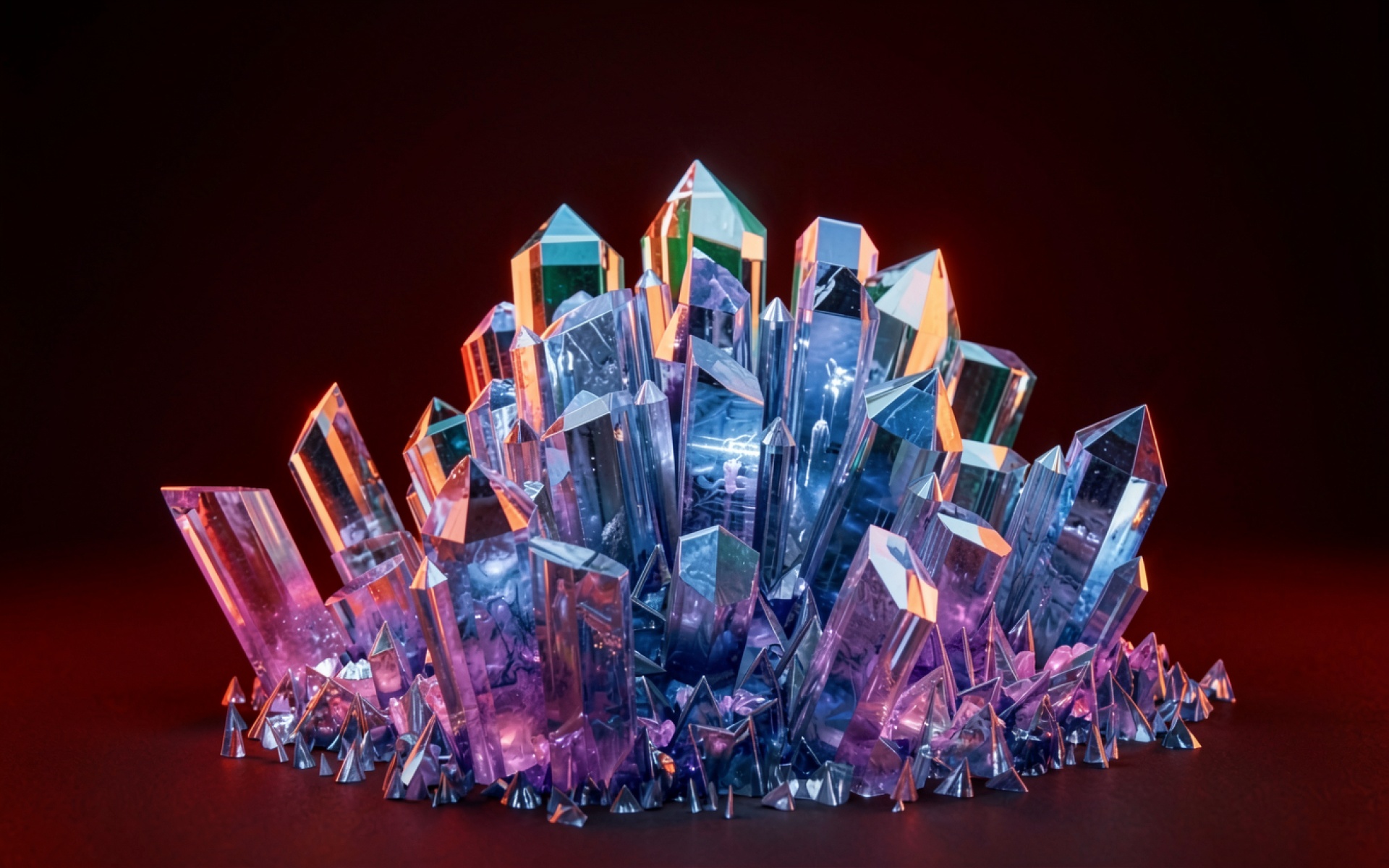 Техническое исполнение обоев акцентирует внимание на гранях кристаллов и их прозрачности. Освещение создает четкие блики на острых кромках, а глубокие тени подчеркивают объем каждой фигуры. Плавные градиенты фона переходят от темно-бордового к черному, создавая контраст с холодным синим свечением объектов. Перед загрузкой доступен удобный предпросмотр для оценки качества отображения на вашем экране.