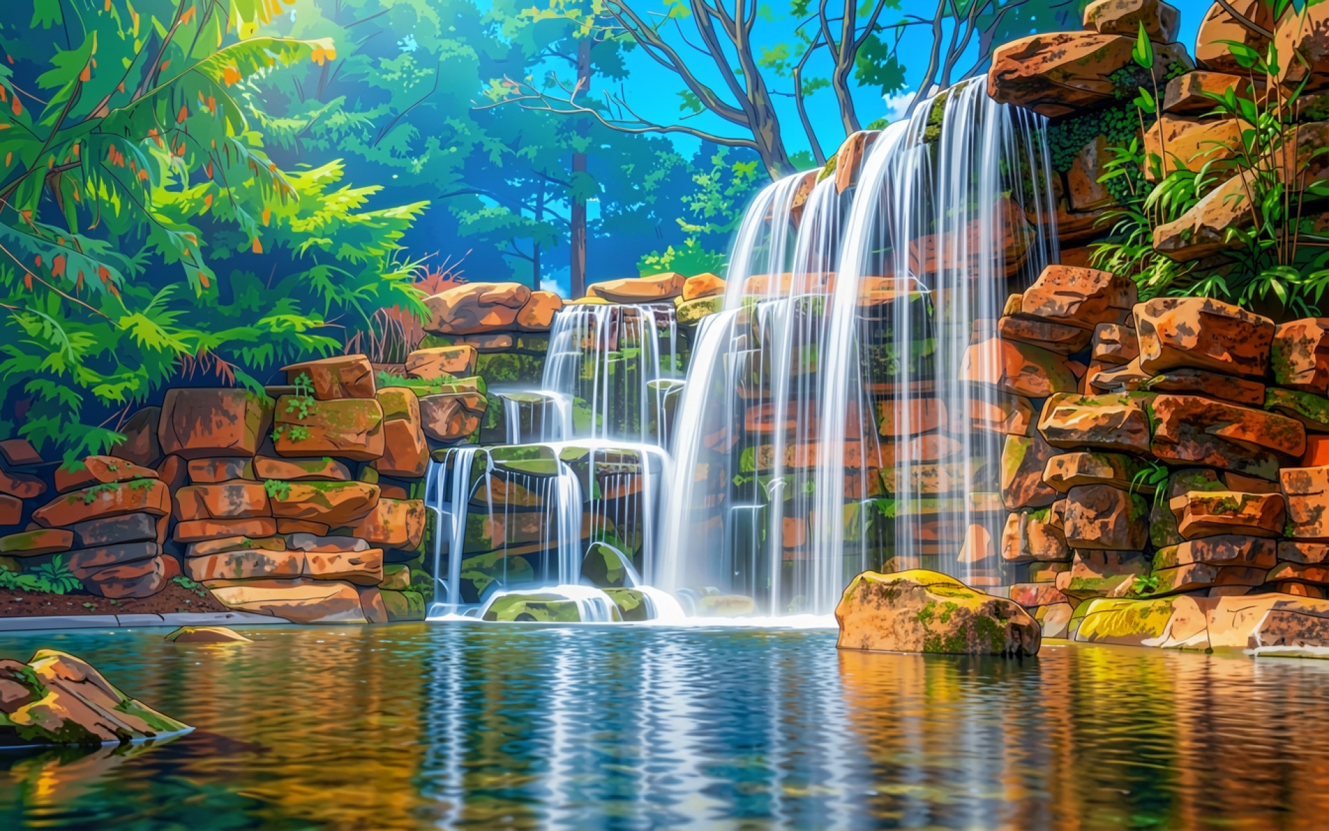 Техническое исполнение файла подчеркивает контраст между белыми потоками воды и пористой текстурой камня. Освещение имитирует дневной свет, создавая мягкие блики на поверхности пруда и глубокие тени в расщелинах скал. Градиенты синего неба плавно переходят в насыщенную зелень листвы, а перед скачиванием доступен удобный предпросмотр для оценки качества на экране