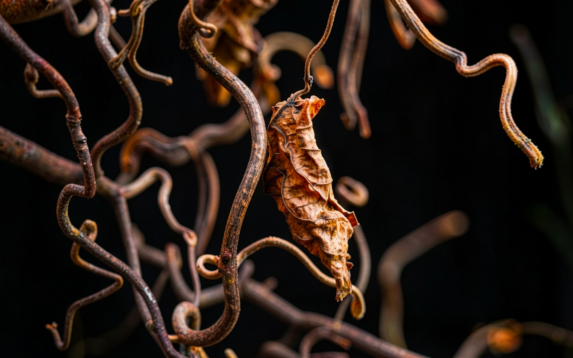 Изображение детально передает хрупкую текстуру органики с акцентом на прожилки и заломы поверхности. Контрастное освещение создает четкие блики на изгибах стеблей, в то время как глубокие тени подчеркивают объем каждой детали. Плавные переходы темного фона исключают визуальный шум, позволяя сосредоточиться на теплых охристых оттенках объекта. На сайте доступен удобный предпросмотр перед скачиванием для оценки качества на экране.