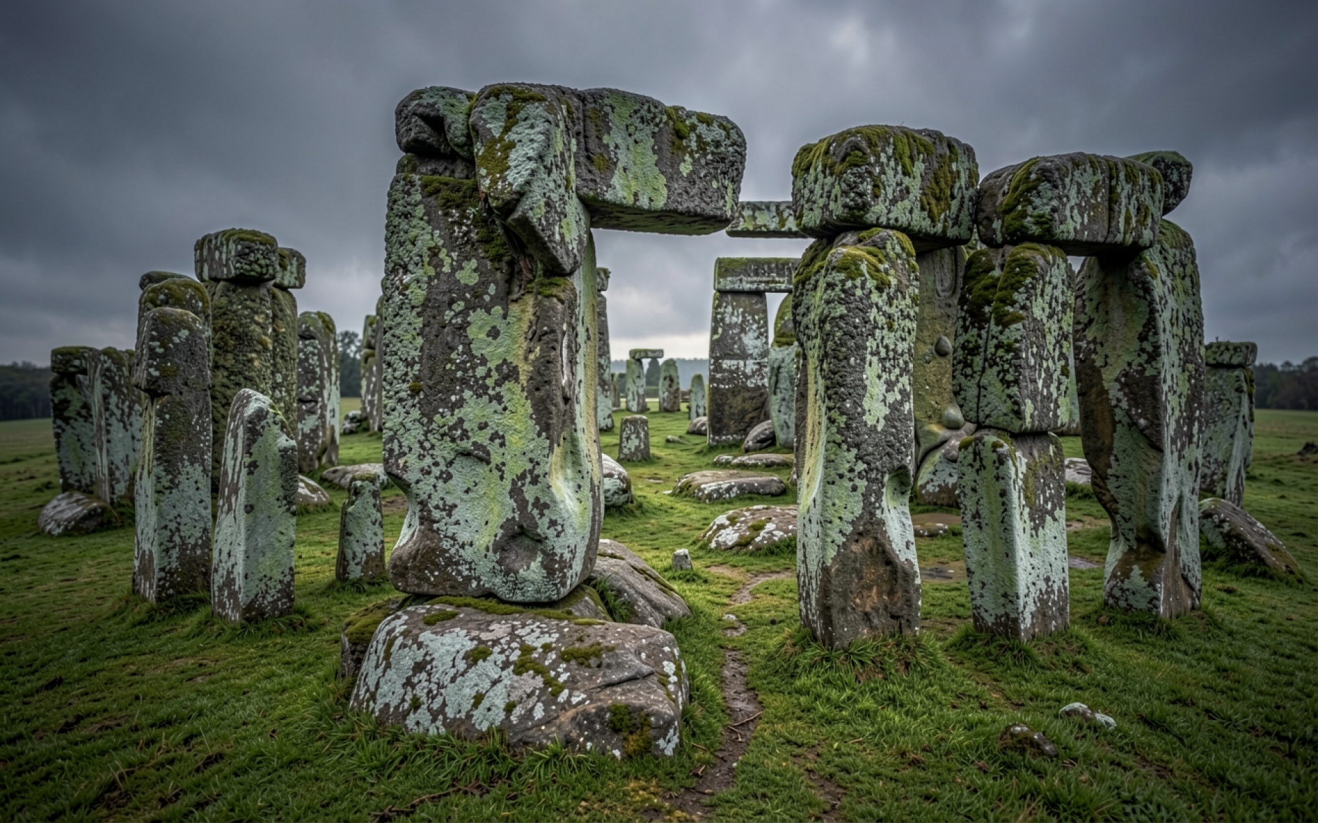 Изображение детально передает шероховатую текстуру камня и органические пятна зеленого лишайника. Мягкое рассеянное освещение пасмурного дня исключает резкие контрасты, создавая плавные градиенты серого неба и насыщенный зеленый тон травы. Глубокие тени в расщелинах монолитов подчеркивают их массивность и объем. На сайте доступен удобный предпросмотр перед скачиванием для оценки качества на вашем экране.