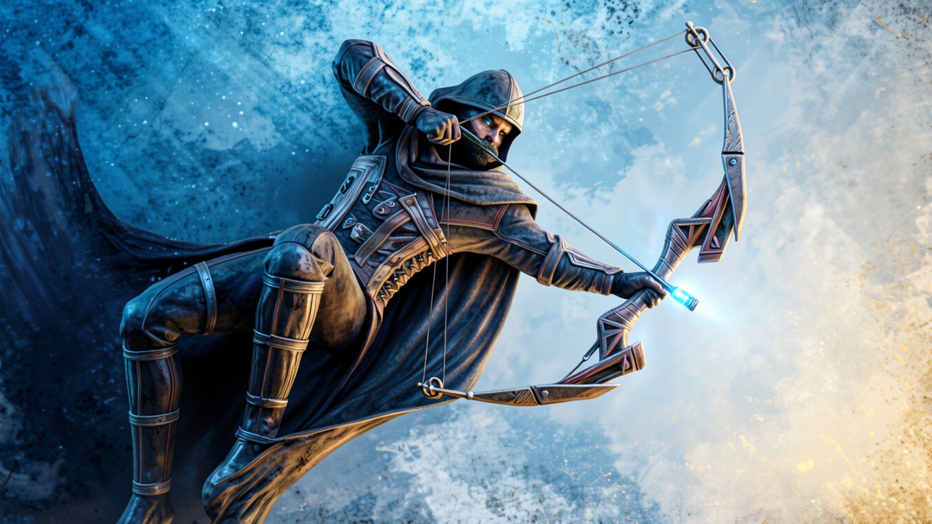 Изображение детально передает текстуру потертой кожи и металлических элементов экипировки. Контрастное освещение создает глубокие тени в складках плаща, а точечные блики подчеркивают изгибы лука. Синий градиент энергетического заряда стрелы создает мягкое свечение на лице персонажа и элементах брони. Фон с эффектом морозного тумана дополняет общую композицию за счет плавных переходов холодного спектра. На сайте доступен удобный предпросмотр перед скачиванием для оценки качества на экране.