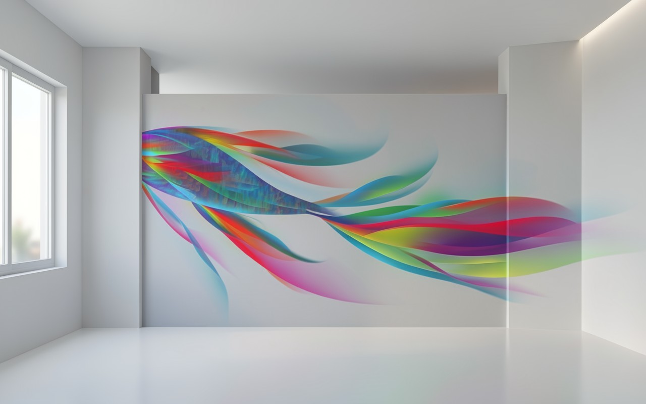 Скачайте с нашего сайта обои 'Абстрактные цветные волны в белом интерьере' в формате JPG, так как изображение прошло минимальное сжатие, сохранив детали.