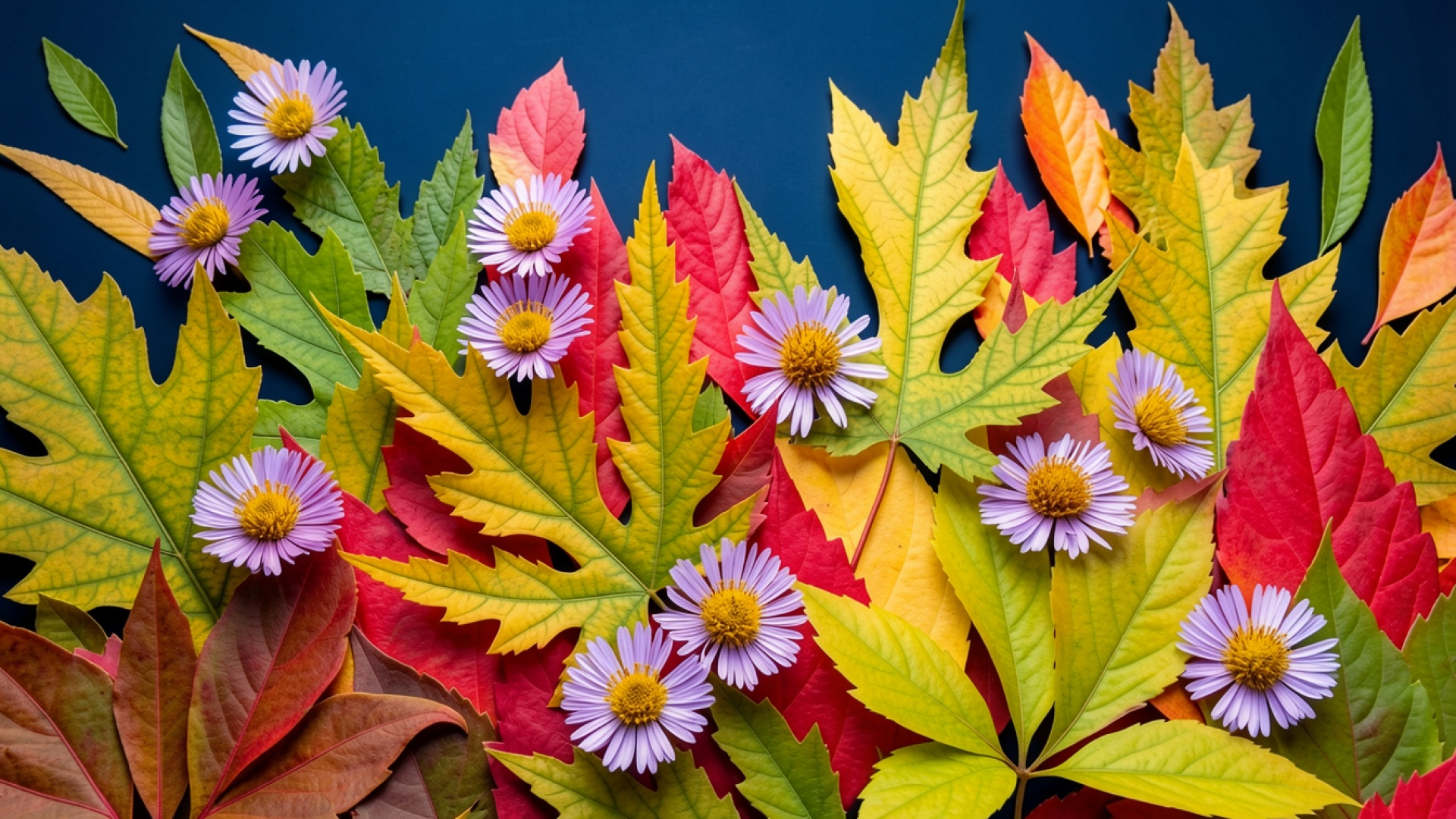 Техническое исполнение кадра подчеркивает контраст между теплыми оттенками желтых и красных листьев и глубоким темно-синим фоном. Особое внимание уделено текстуре лепестков астры и прожилкам кленовых листьев, где мягкие градиенты переходят в четкие блики. Распределение света создает объем каждой детали, а глубокие тени между слоями растительности добавляют композиции глубины. Перед загрузкой на сайте доступен удобный предпросмотр для оценки качества отображения на вашем экране