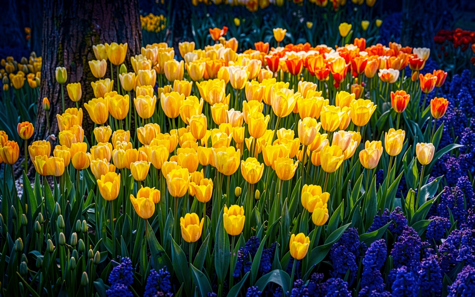Желтые тюльпаны в весеннем саду при дневном свете обои