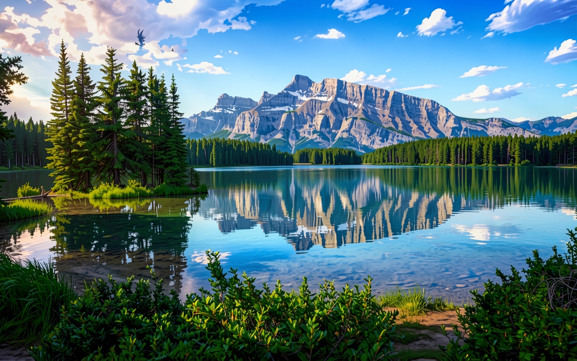 Изображение характеризуется высокой детализацией текстур скальных пород и игольчатой листвы елей. Освещение имитирует дневной свет с мягкими градиентами на небе и четкими бликами на водной глади. Контрастные тени в лесной зоне подчеркивают объем ландшафта, а зеркальное отражение гор создает симметрию композиции. На сайте доступен удобный предпросмотр перед загрузкой для оценки качества на экране.