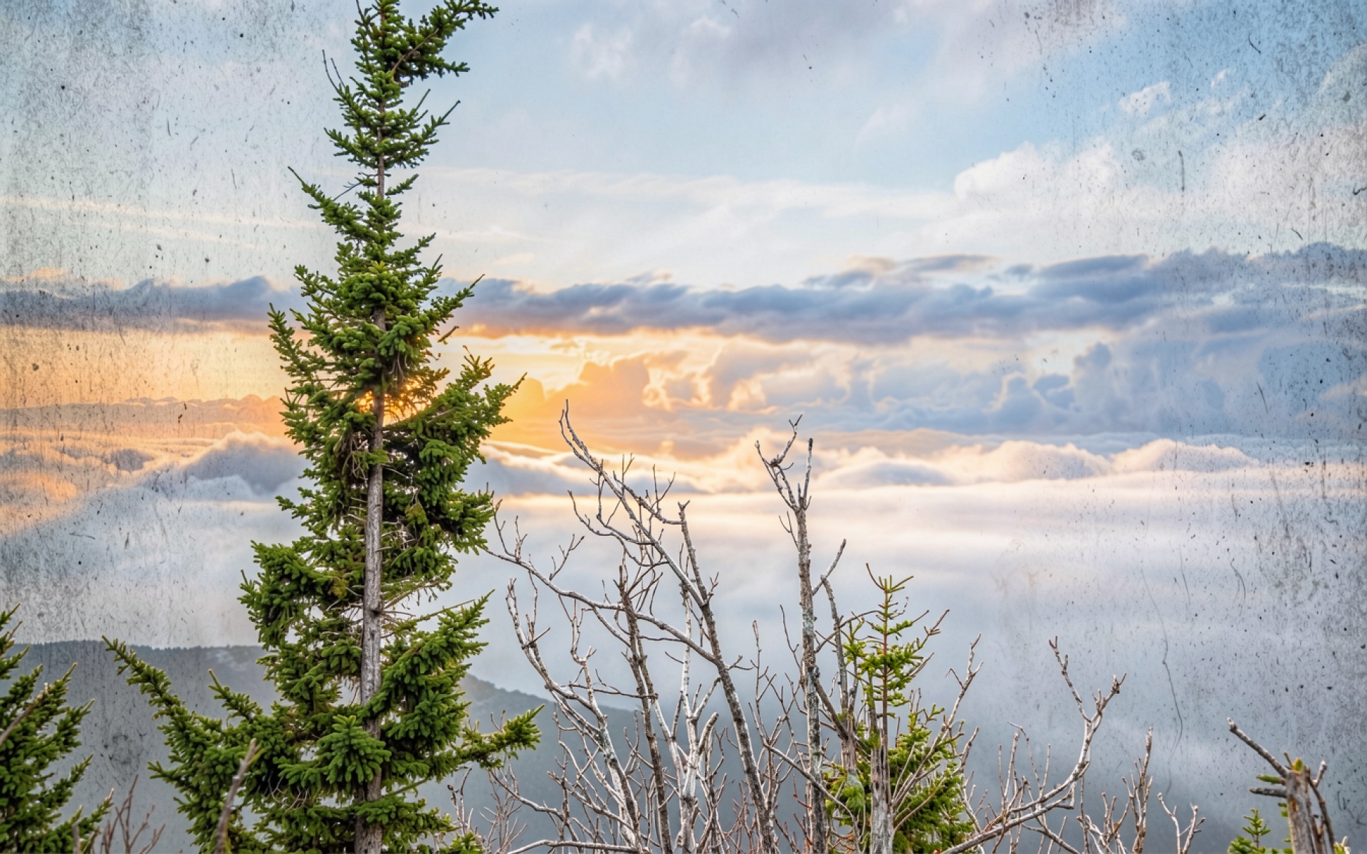 Изображение детально передает текстуру хвои и шероховатость коры дерева. Контраст между темным силуэтом ели и мягким градиентом неба создает объемную композицию. Освещение подчеркивает края ветвей, создавая эффект контурного света, а плотный слой облаков внизу формирует естественную дымку с плавными переходами тонов. На сайте доступен удобный предпросмотр перед скачиванием для оценки качества на экране.