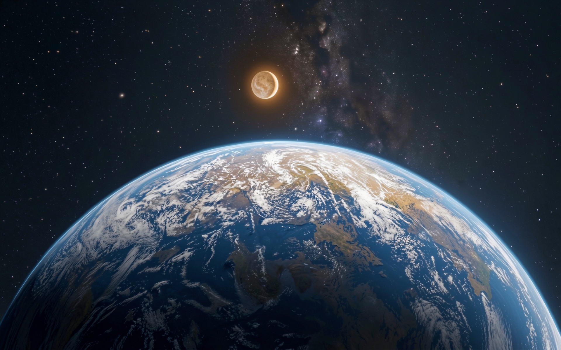 На нашем сайте вы можете скачать обои Планета Земля и Луна в темном космосе в JPG для ПК или телефона – и вот почему: полная цветопередача сохраняется без потери качества.