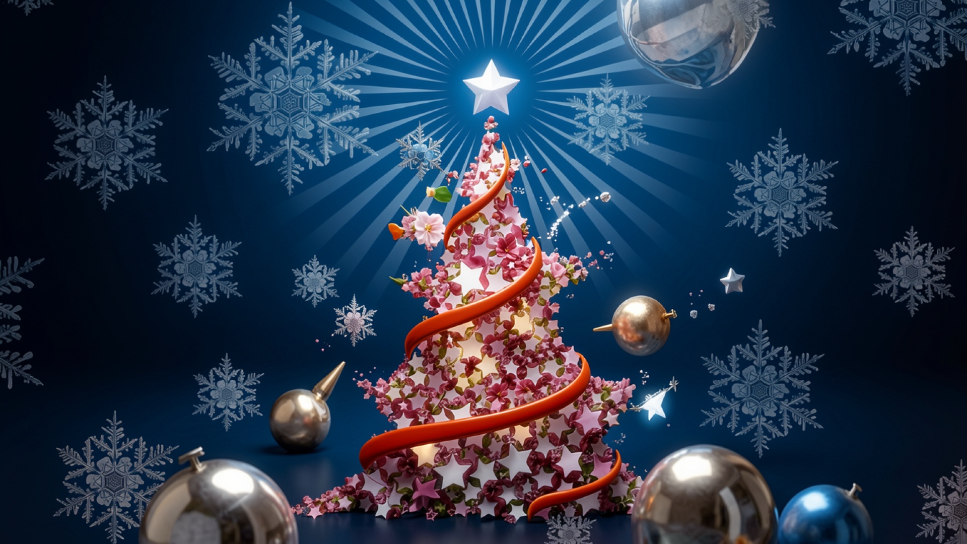 Изображение отличается детальной проработкой текстур лепестков цветов, из которых состоит дерево, и плавными градиентами темно-синего фона. Контрастное освещение создает четкие блики на поверхности металлических шаров и подчеркивает сияние звезды на вершине. Мягкие тени в нижней части композиции добавляют объему, а радиальные лучи света создают эффект глубины пространства. На сайте доступен удобный предпросмотр перед загрузкой для оценки качества отображения на вашем экране.