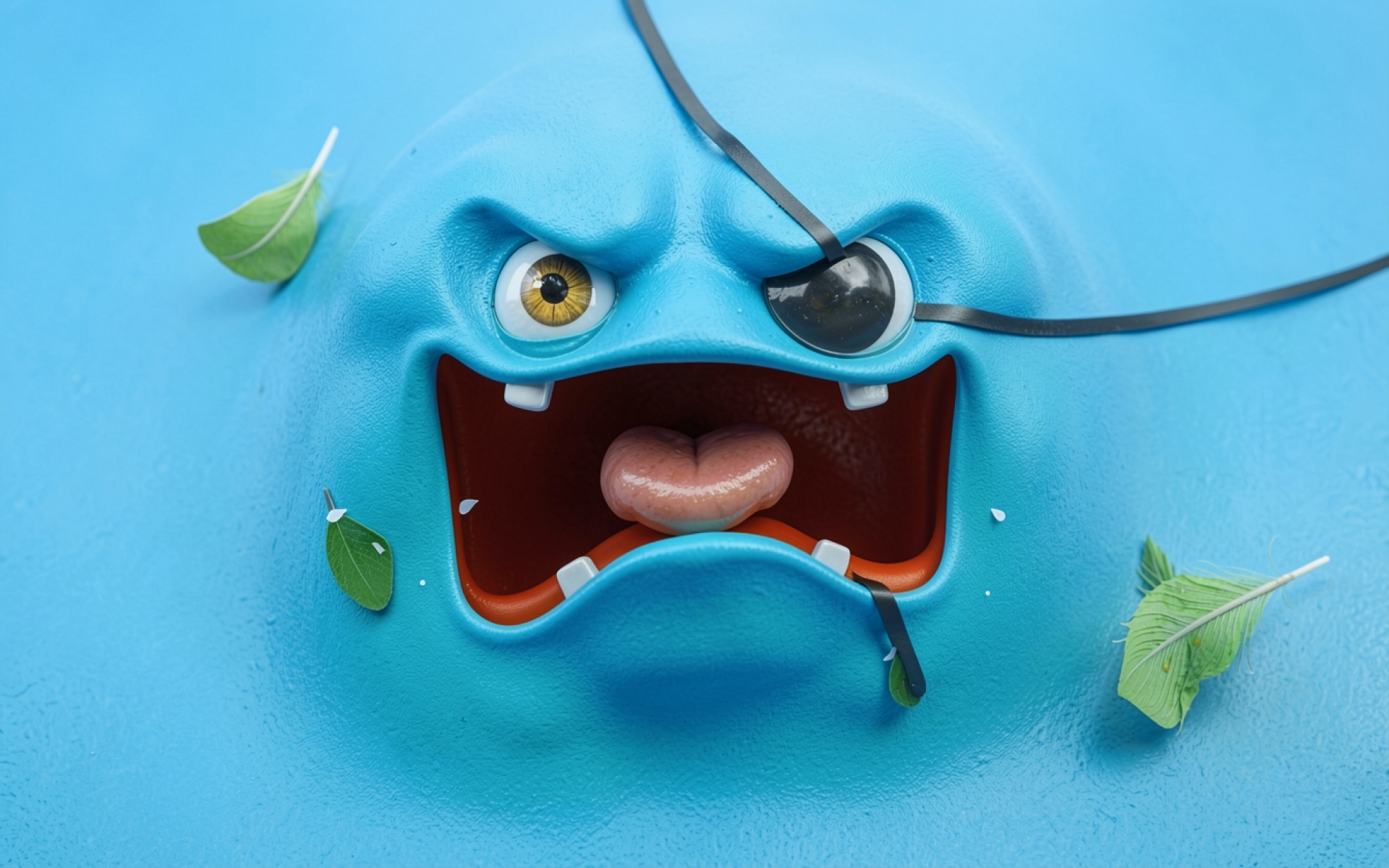 Изображение характеризуется однородной матовой текстурой кожи персонажа и мягким рассеянным освещением. Акценты расставлены на контрасте между насыщенным синим фоном и теплыми оттенками языка и радужки глаза. Плавные градиенты в области рта создают объем, а четкие тени от повязки подчеркивают глубину сцены. На сайте доступен удобный предпросмотр перед загрузкой для оценки качества на экране.
