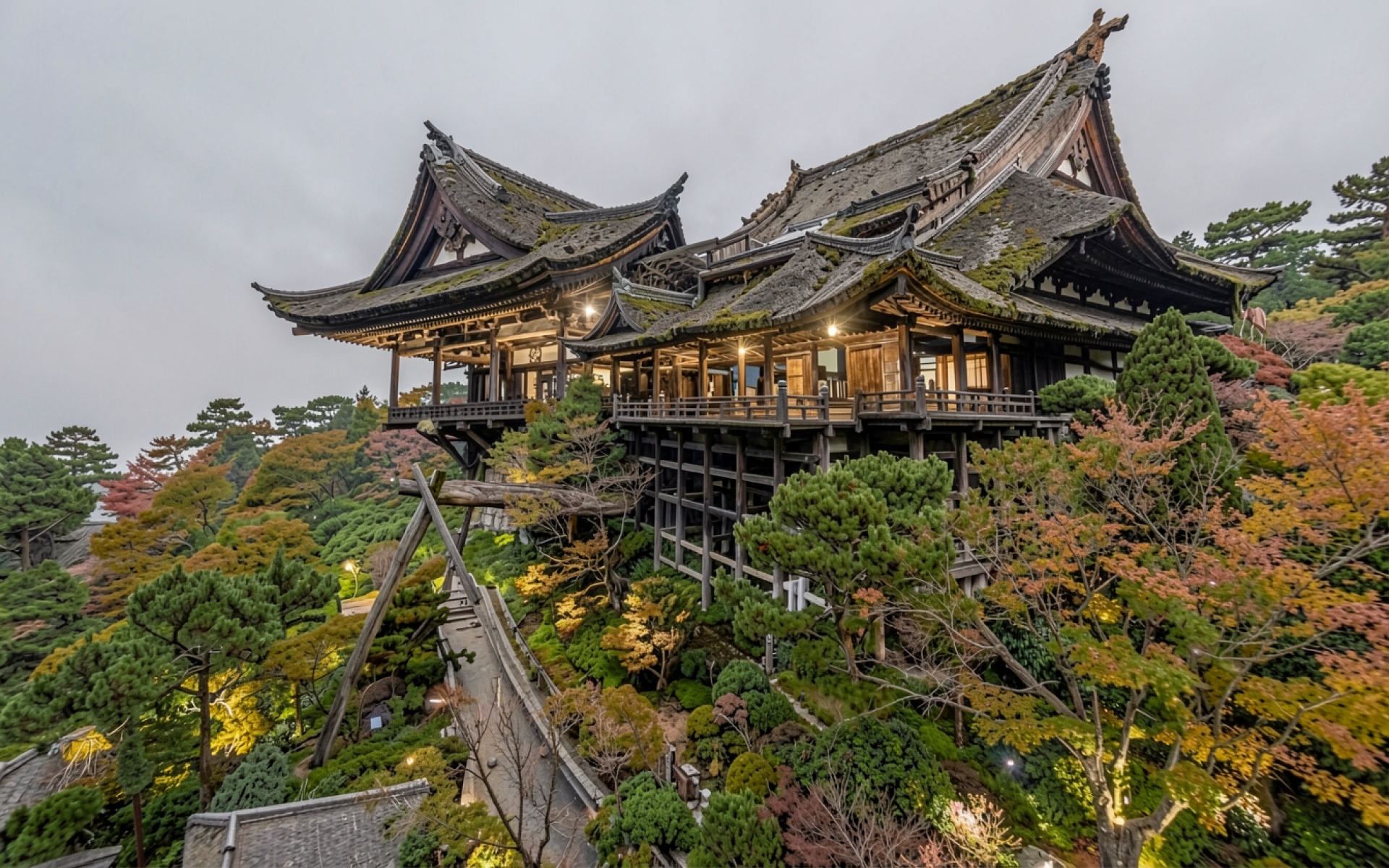 Изображение детально передает текстуру темного дерева и старой черепицы с наростами мха. Мягкий свет из окон храма создает контрастные блики на деревянных балках, а глубокие тени подчеркивают многоуровневую архитектуру здания. Плавные градиенты серого неба в тумане создают атмосферный фон, который выделяет насыщенную зелень и охристые оттенки осенней листвы. На сайте доступен удобный предпросмотр перед скачиванием для оценки качества на экране.