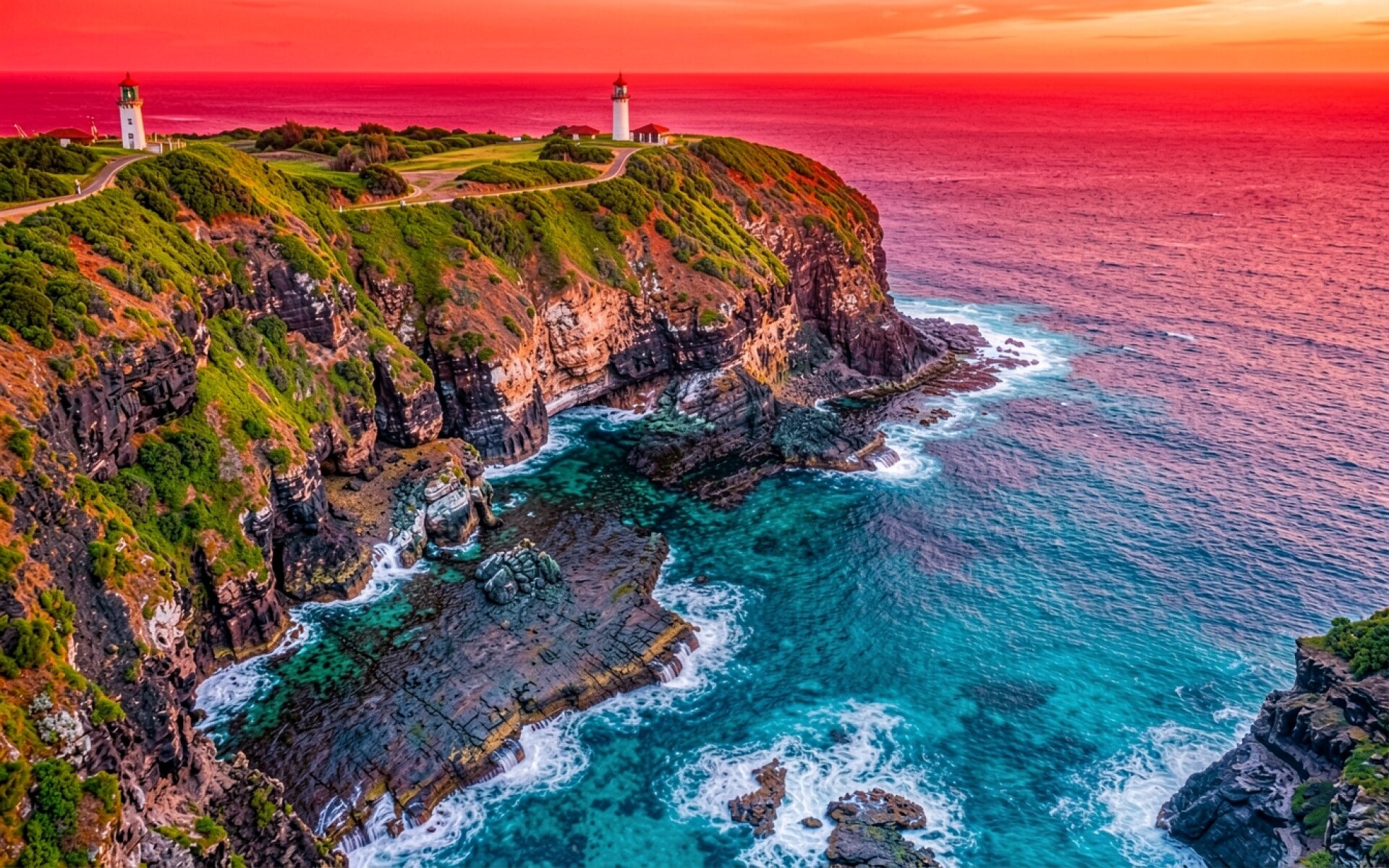Изображение детально передает текстуру базальтовых пород и пенные гребни бирюзовой воды. Контраст между глубокими тенями в расщелинах скал и яркими бликами на поверхности океана создает объемную композицию. Градиент неба от насыщенного алого до оранжевого плавно переходит в отражения на воде, подчеркивая геометрию белых башен маяков. Перед загрузкой доступен удобный предпросмотр для оценки качества отображения всех цветовых переходов на вашем экране.