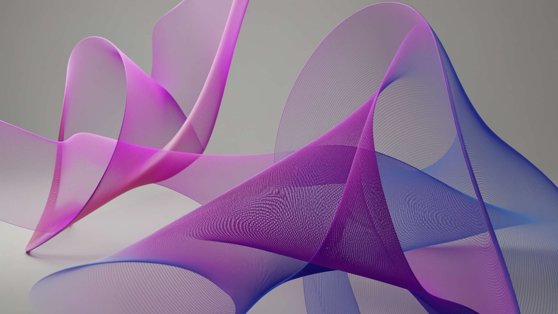 Изображение демонстрирует сложную игру полупрозрачных текстур с плавными градиентами от глубокого индиго до ярко-пурпурного. Освещение создает мягкие блики на изгибах ткани, подчеркивая объем и динамику композиции на нейтральном сером фоне. Сайт предоставляет удобный предпросмотр перед скачиванием для оценки качества на экране.