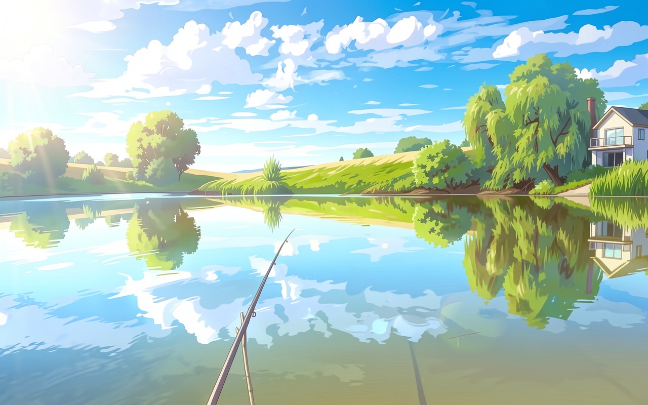 Изображение отличается детальной проработкой текстуры воды с четкими зеркальными отражениями прибрежной растительности и облаков. Освещение имитирует яркий полуденный свет, создавая мягкие градиенты в небе и глубокие контрасты в тени листвы ивы. Акценты расставлены на бликах поверхности озера и тонких линиях рыболовного снаряжения. На сайте доступен удобный предпросмотр перед загрузкой для оценки качества на экране.