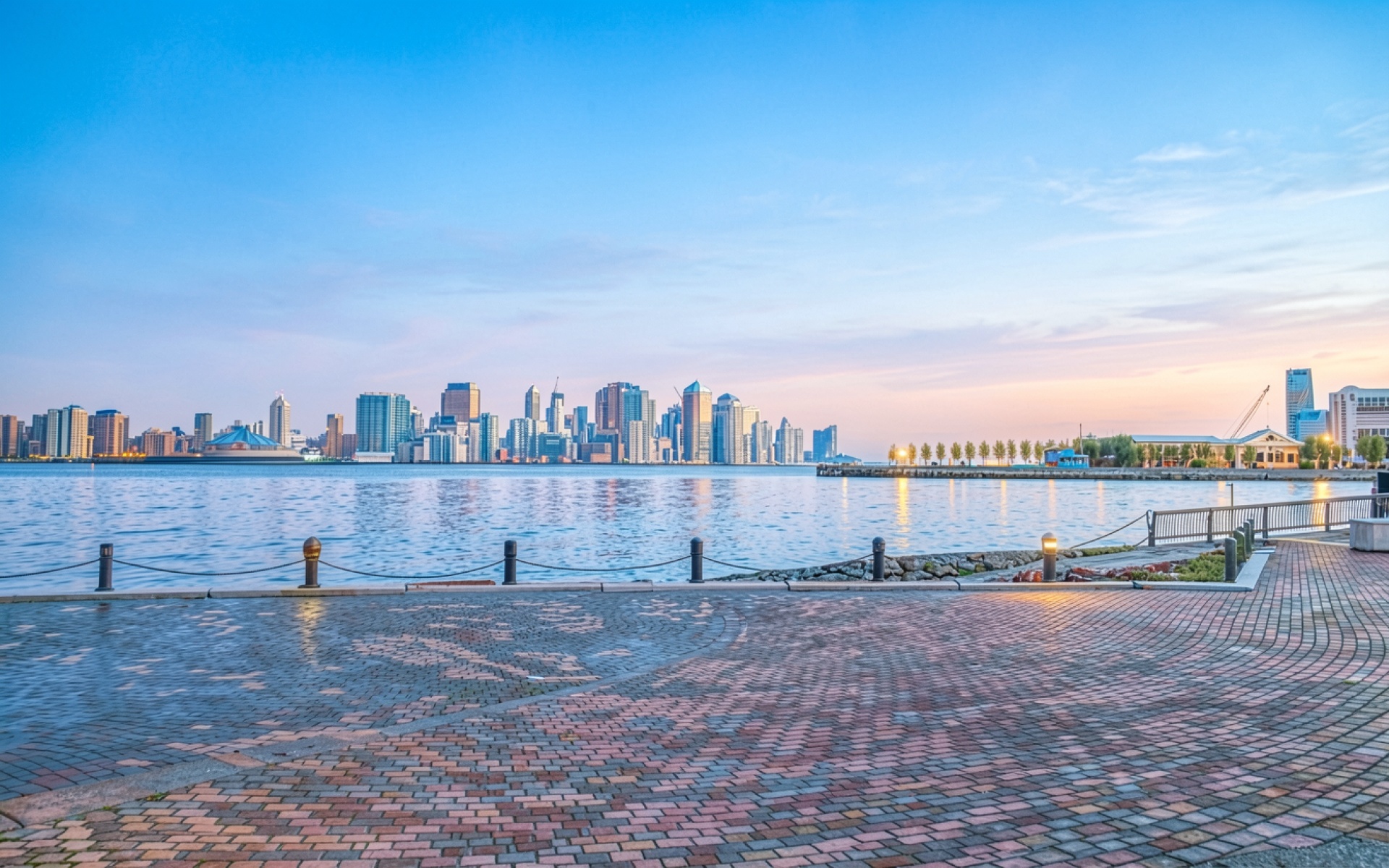 Изображение детально передает текстуру кирпичной мостовой на переднем плане и плавные градиенты вечернего неба. Освещение характеризуется мягкими бликами на поверхности воды и четкими контурами небоскребов, где тени подчеркивают геометрию городской застройки. Сайт предоставляет удобный предпросмотр перед загрузкой для оценки качества отображения на вашем экране.