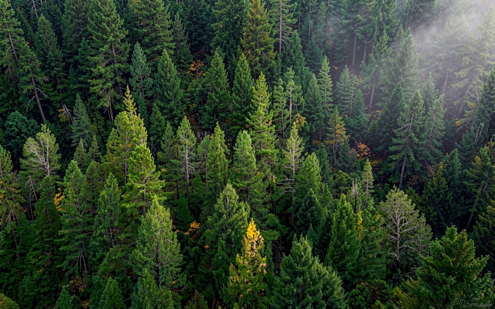 Хвойный лес в тумане приглушенных тонов обои