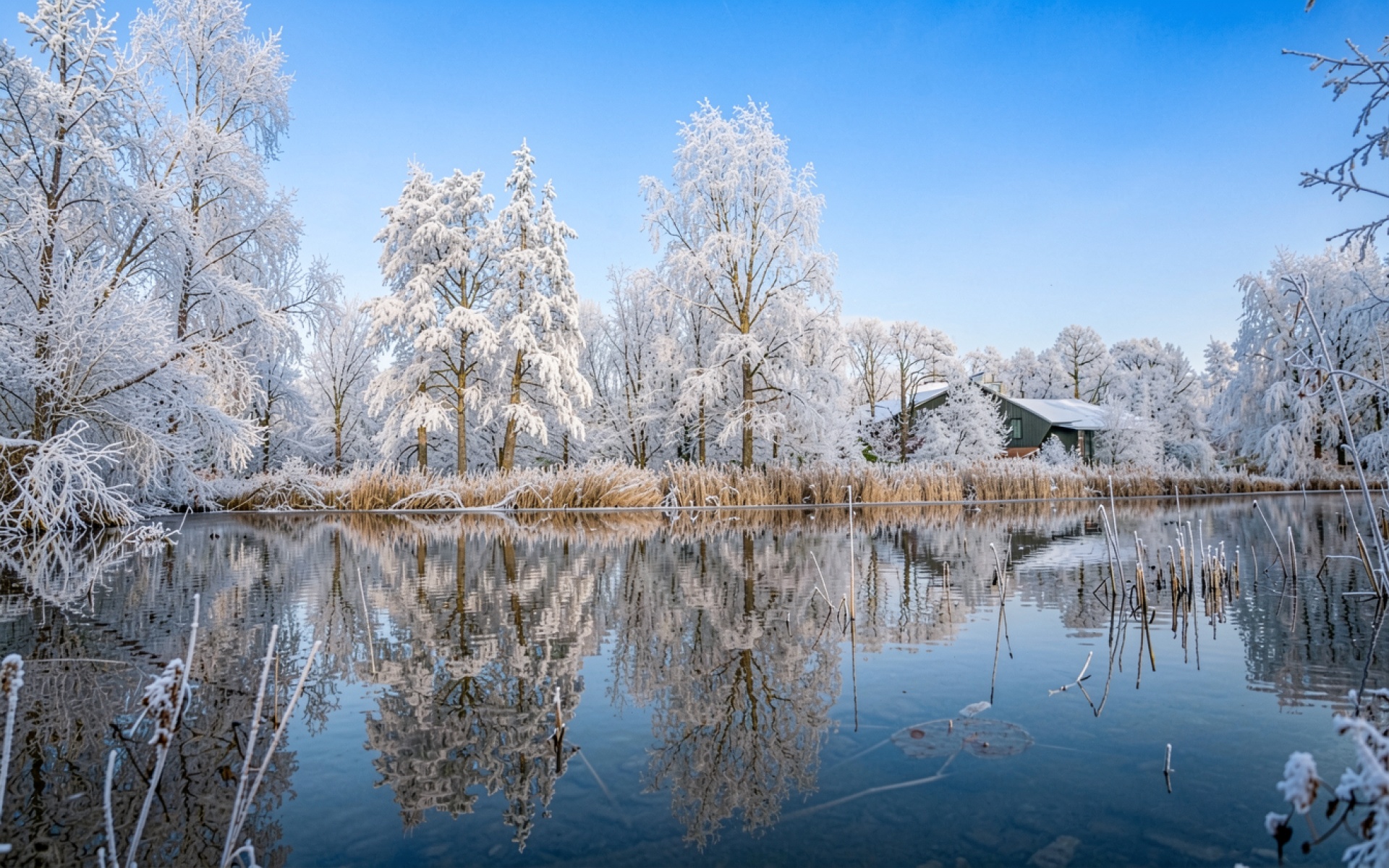 Изображение детально передает структуру инея на ветвях, создавая выразительный контраст между белым снегом и глубоким синим градиентом чистого неба. Мягкое зимнее освещение формирует деликатные тени в кронах деревьев и четкие зеркальные отражения на поверхности воды. Текстура прибрежного камыша подчеркивает глубину сцены, а плавные переходы света на заднем плане добавляют объему. На сайте предусмотрен удобный предпросмотр перед загрузкой для оценки качества отображения на вашем экране.