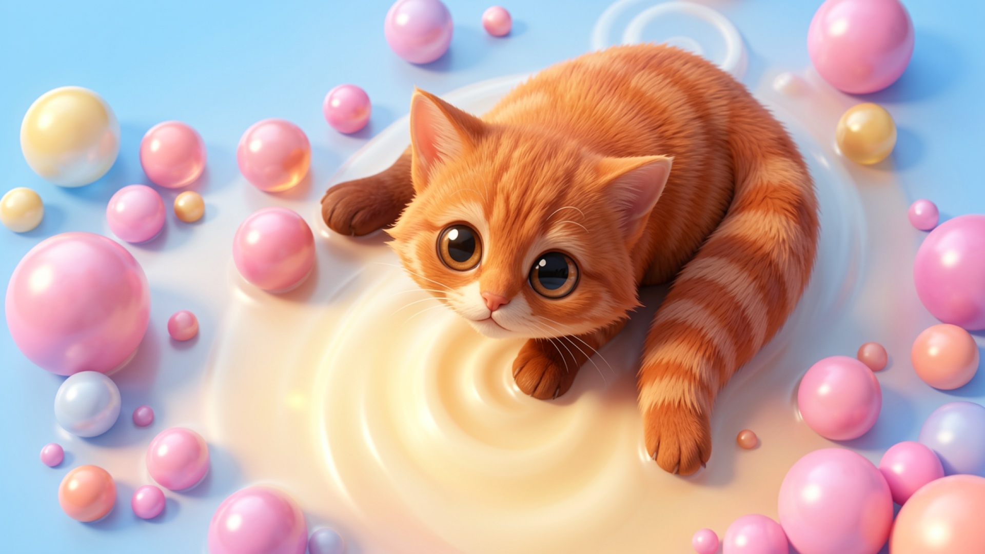 Рыжий котенок в молоке с розовыми шарами обои