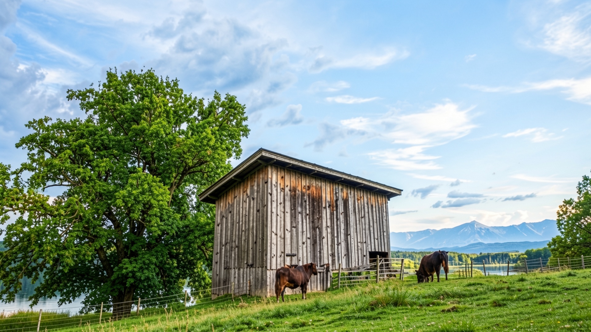 Изображение детально передает грубую текстуру старого дерева на стенах постройки и мягкий ворс шерсти животных. Освещение создает естественные блики на траве и плавные градиенты голубого неба с легкими облаками. Контраст между темным силуэтом амбара и ярко-зеленым пастбищем подчеркивает глубину пространства. На сайте доступен удобный предпросмотр перед загрузкой для оценки качества на экране.