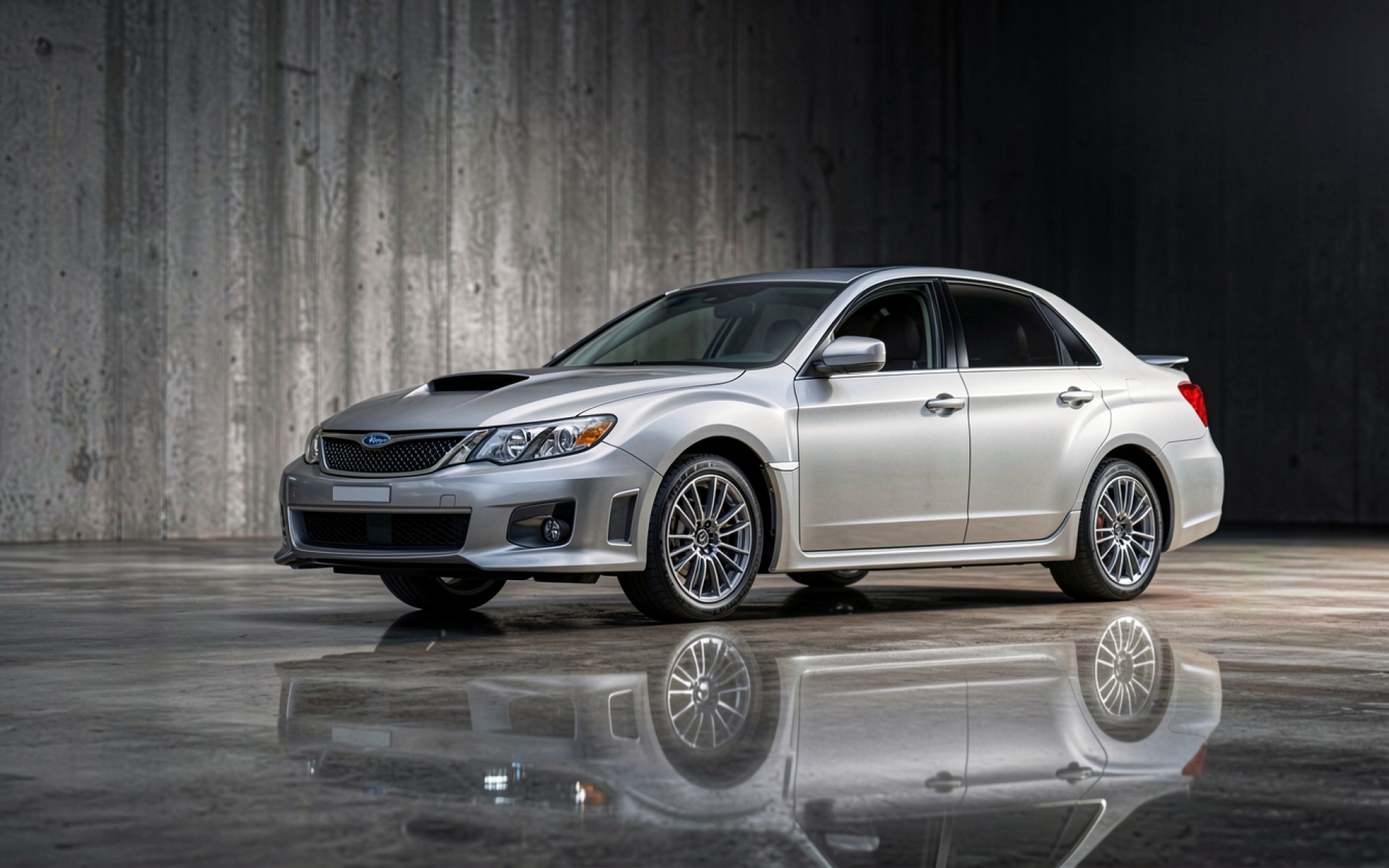 Серебристый Subaru Impreza в бетонном индустриальном гараже