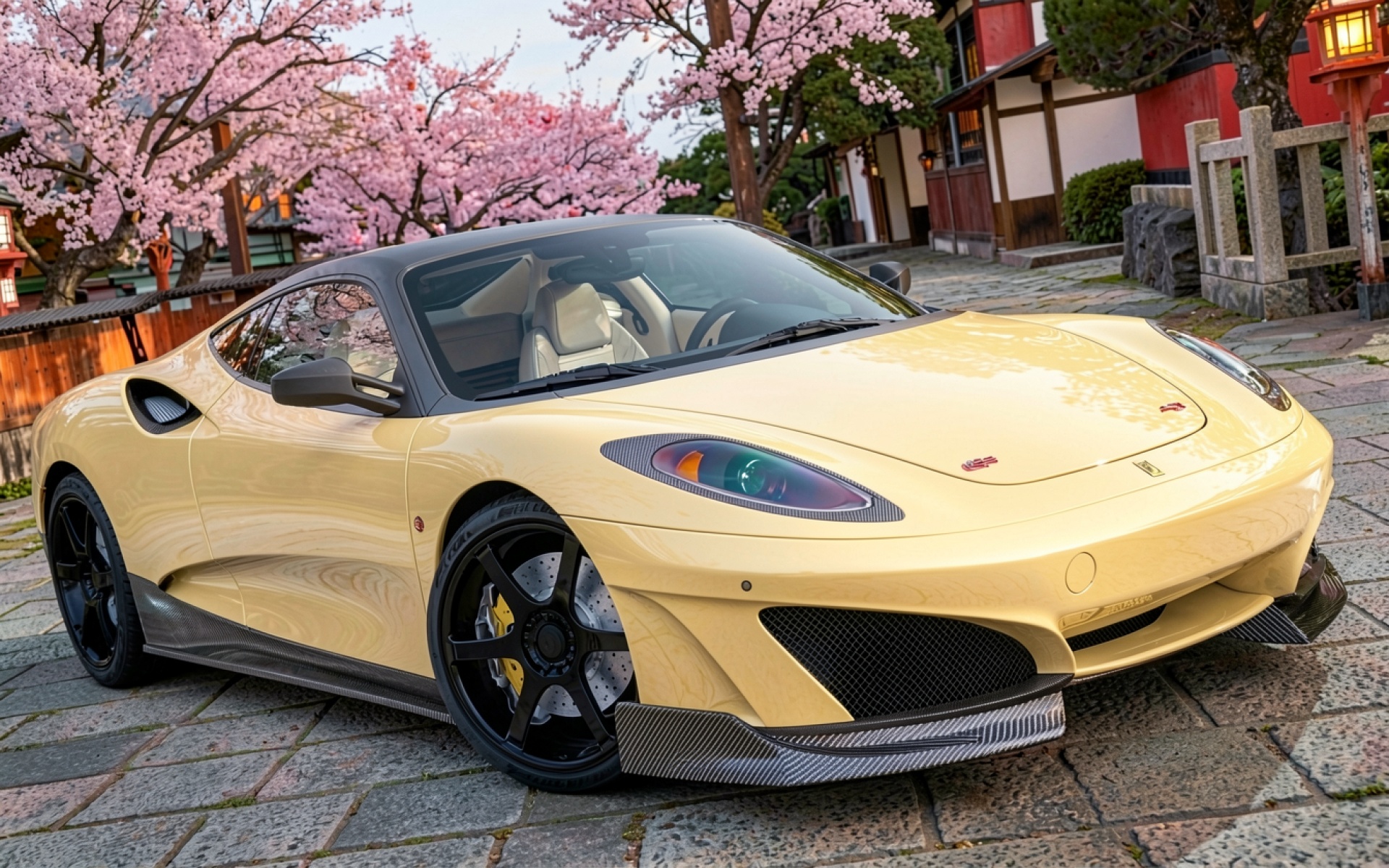 Желтый суперкар Lotus Evora среди цветущей сакуры
