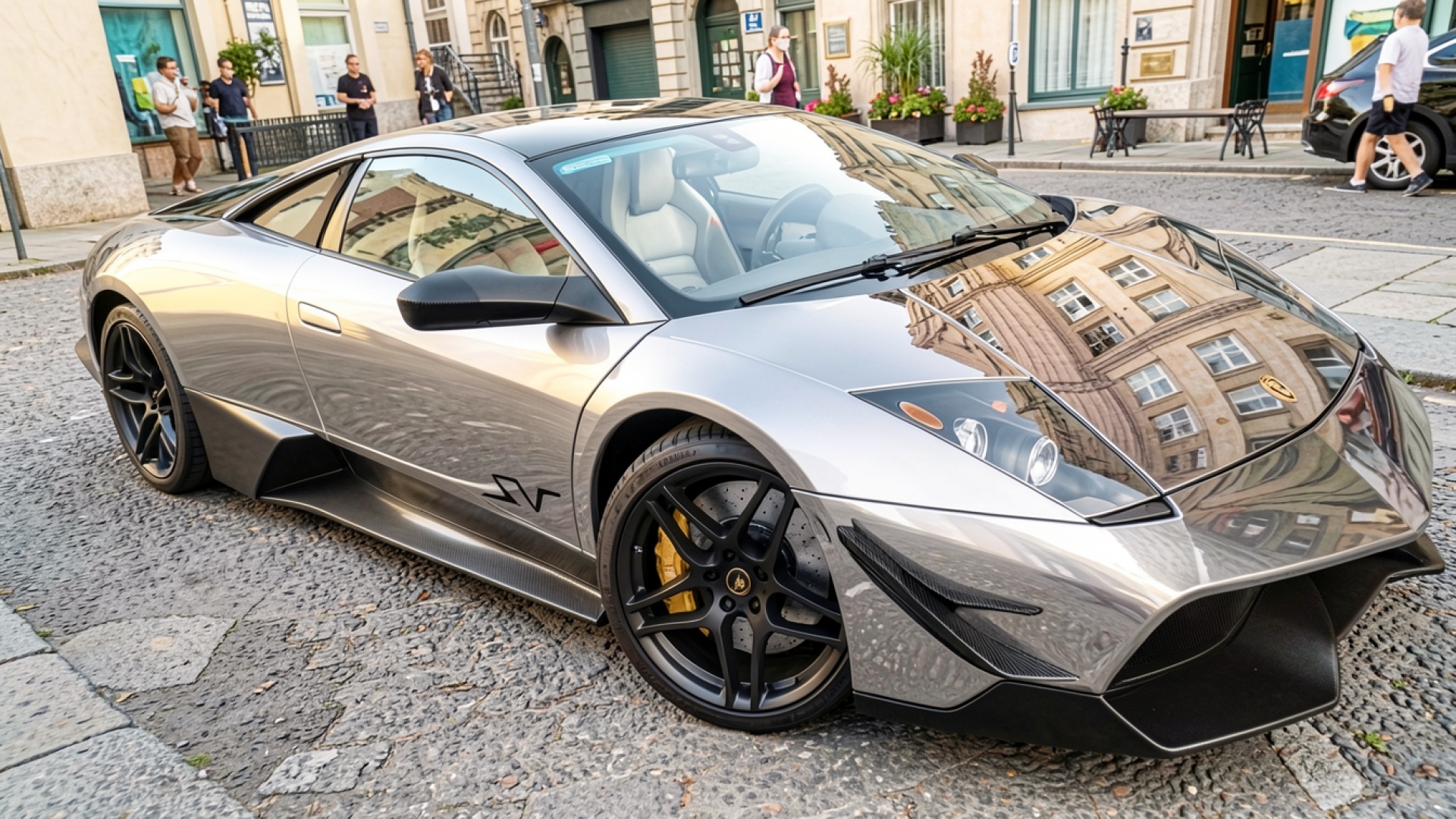 Серебристый Lamborghini Murcielago LP640 в городском окружении