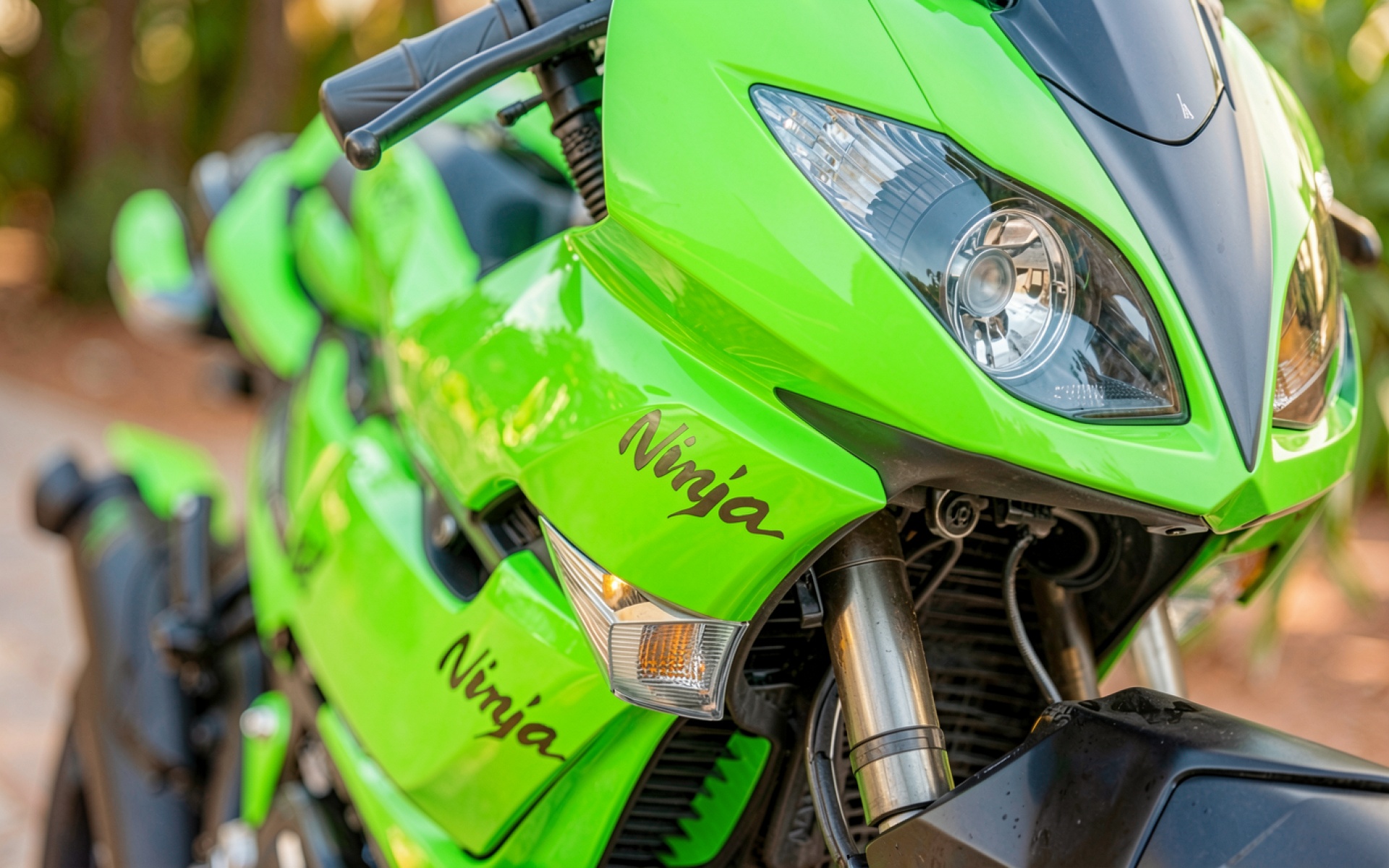 Зеленый спортивный мотоцикл Kawasaki Ninja в городе
