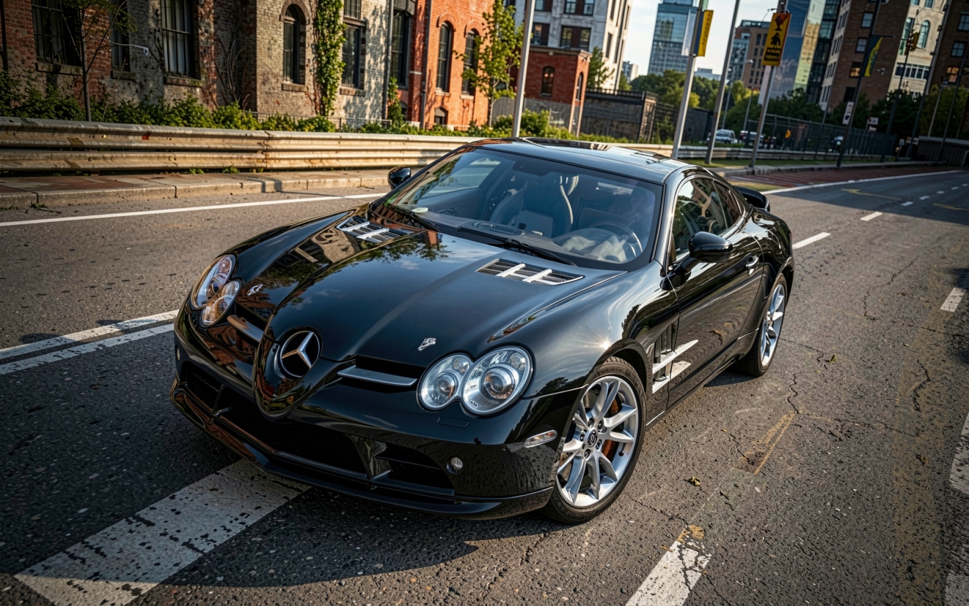 Черный Mercedes-Benz SLR McLaren городской пейзаж