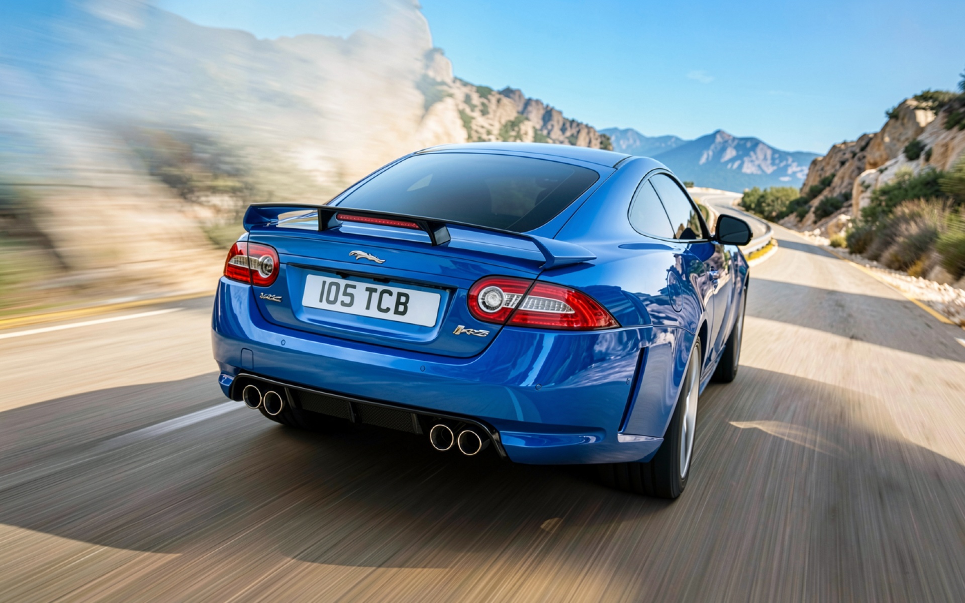 Синий автомобиль Jaguar XKR в движении по дороге