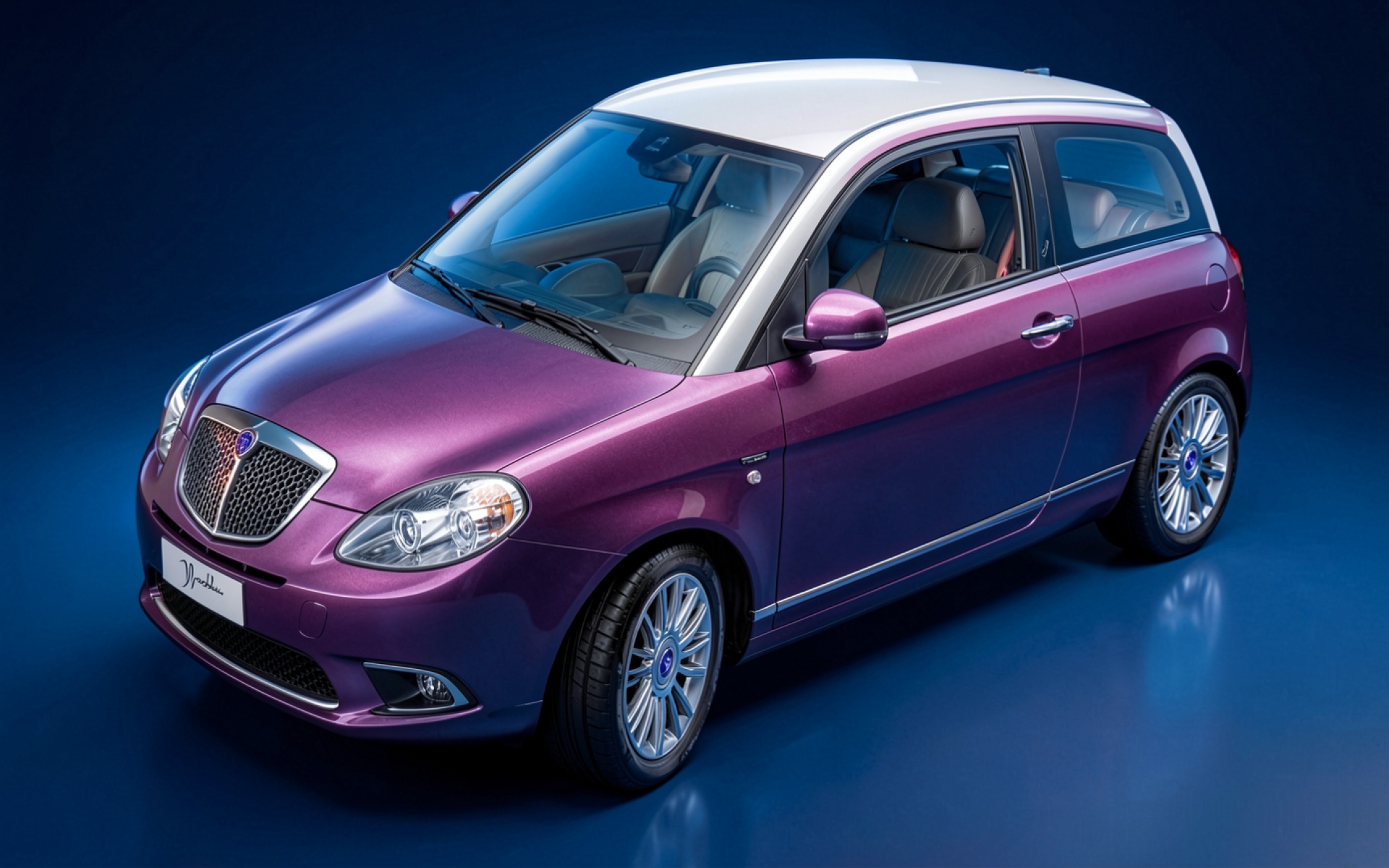 Фиолетовый автомобиль Lancia Ypsilon в синей студии